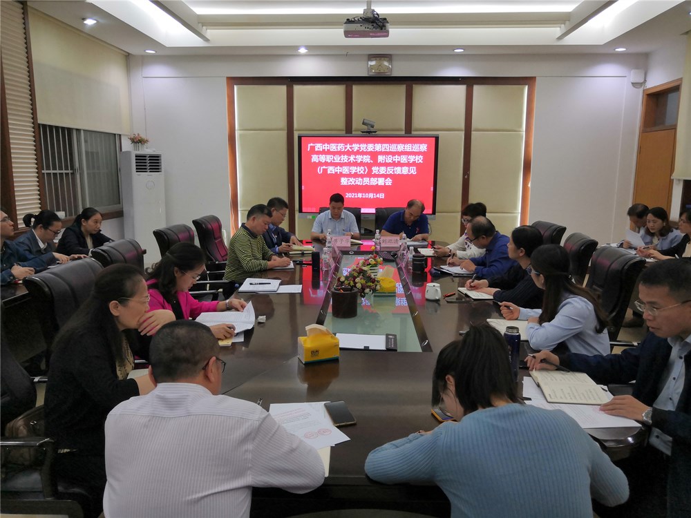 10月14日下午,高职院、附设中医学校党委召开beat365平台唯一官网党委第四巡察组巡察高职院、附设中医学校党委反馈意见整改动员部署会。高职院、附设中医学校党委书记蒋子华,院(校)长刘竑清,副书记、副院(校)长刘武,副院(校)长周琦、林原,纪委书记黄勇,全体中层干部、党支部书记参加会议。