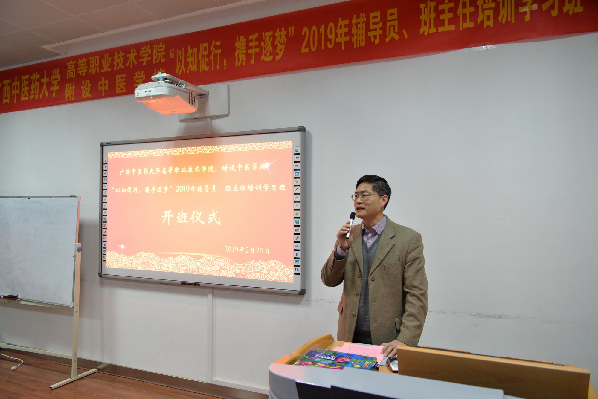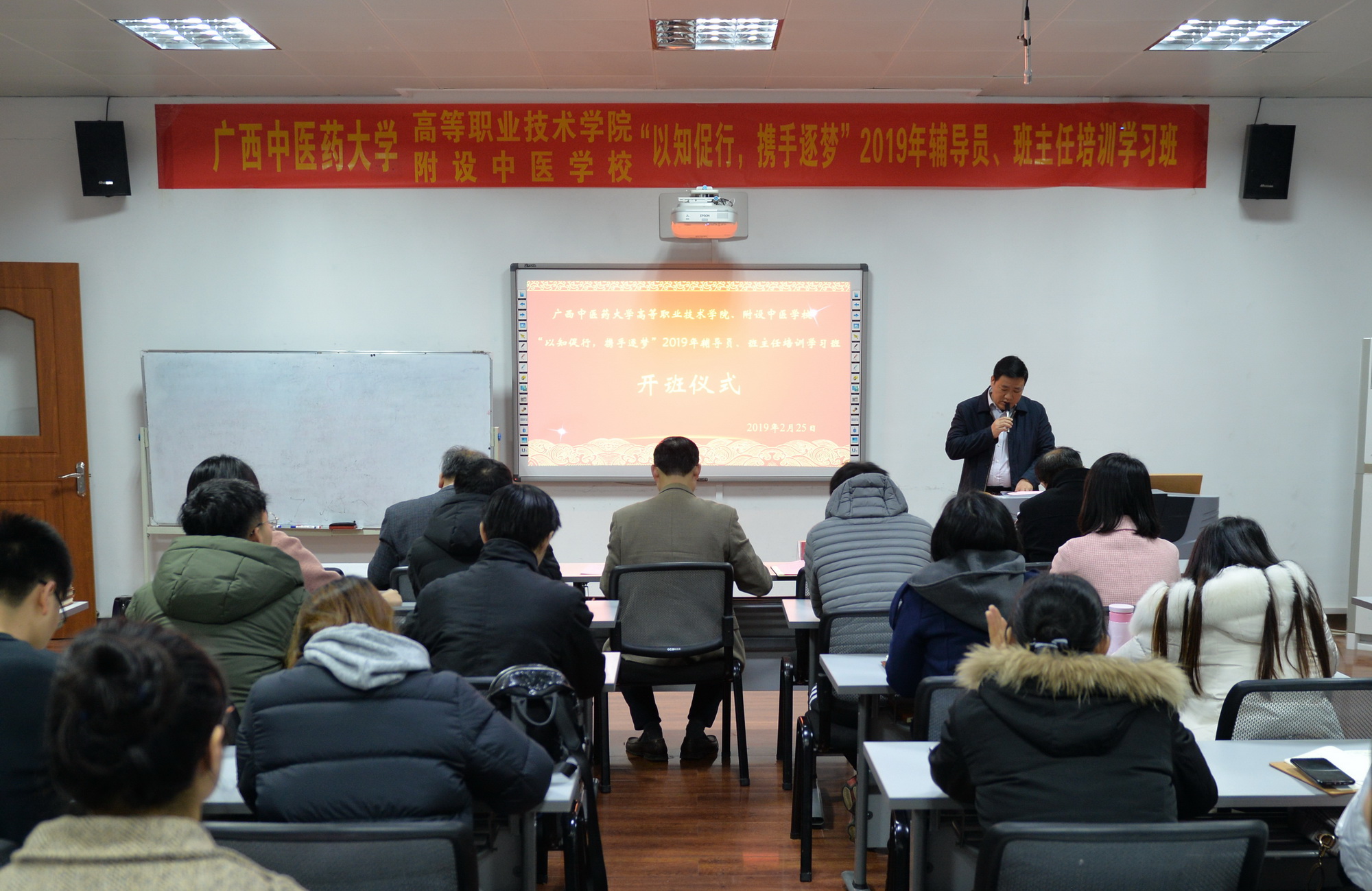 2月25日上午,高等职业技术学院、附设中医学校为期3天的“以知促行,携手逐梦”2019年辅导员、班主任培训班在北湖校区正式开班。beat365平台唯一官网党委副书记何并文出席开班仪式并作专题培训,高职院、附设中医学校党委书记蒋子华、高职院、附设中医学院(校)长刘竑清、副院(校)长黄勇出席仪式,40多人参加了培训。