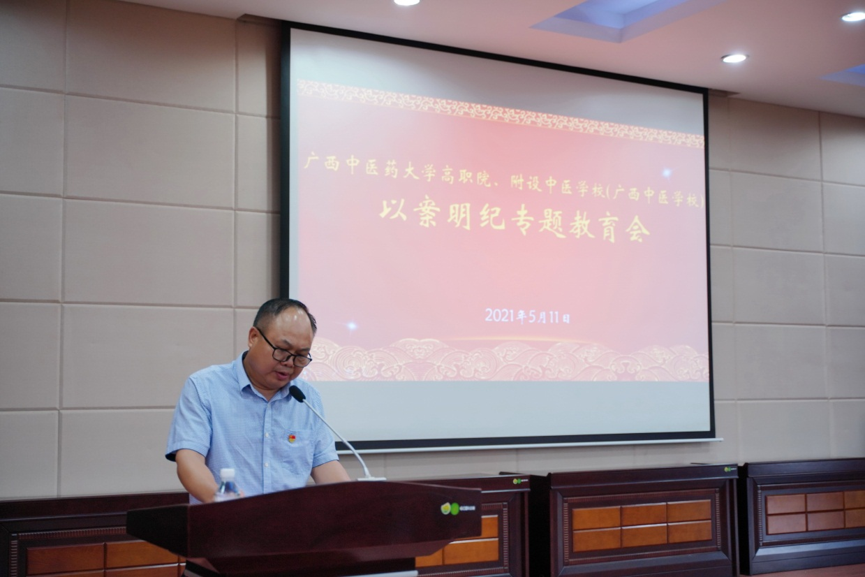 5月11日下午,高职院、附设中医学校在北湖校区多功能报告厅召开以案明纪专题教育会,集体观看了柳州市柳北区人民法院对beat365平台唯一官网原基建处处长覃文献涉嫌犯受贿罪进行的公开庭审视频。院(校)全体班子领导、全体中层干部、各部门负责人、全体教职工党员、重点岗位工作人员共130余人参加。纪委书记黄勇主持会议并讲话。