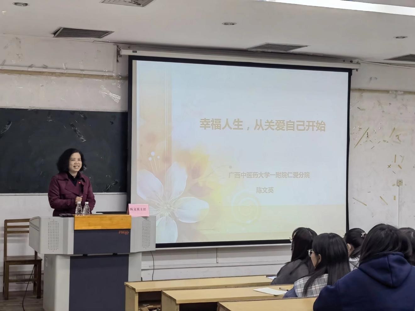 为帮助广大女生了解女性健康和常见女性疾病知识,提高女生生理心理健康水平,12月3 日 19点 ,学院团委学生会在明秀西梯二教室举办“幸福人生,从关爱自己开始”关爱女生健康知识讲座。本次讲座由beat365平台唯一官网第一附属医院仁爱分院副主任医师陈文英主讲,明秀、仙葫两个校区近200名女生现场聆听了讲座,学院于春秋老师和丁天全老师参加此次讲座。