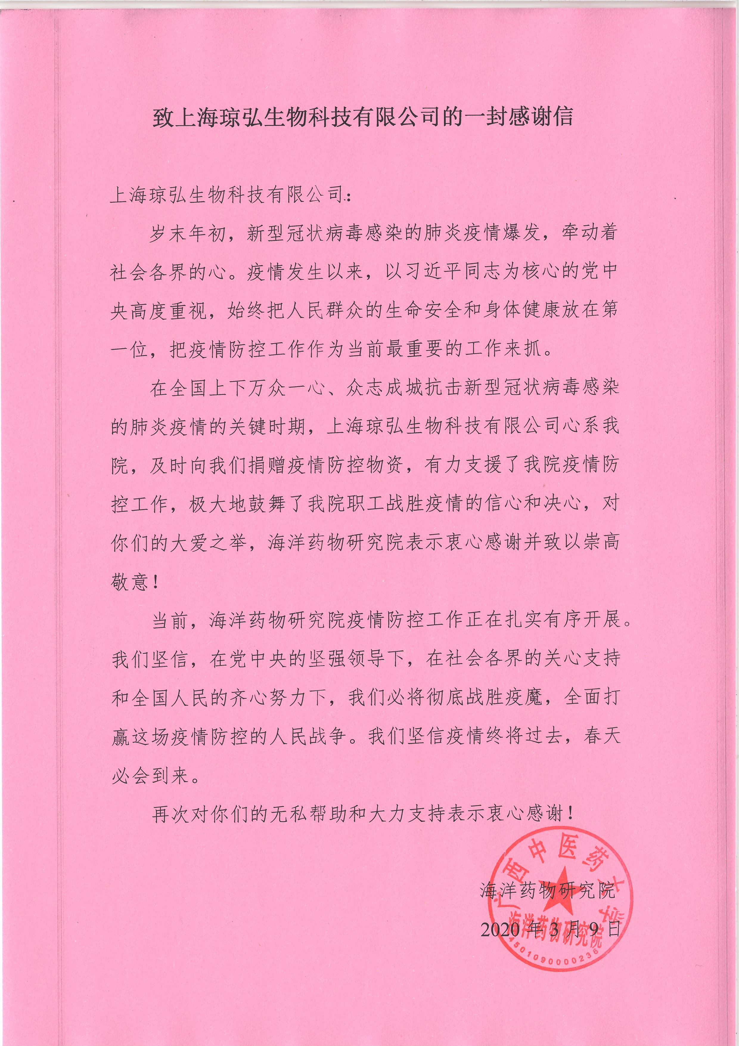 致上海琼宏生物科技有限公司的一封感谢信