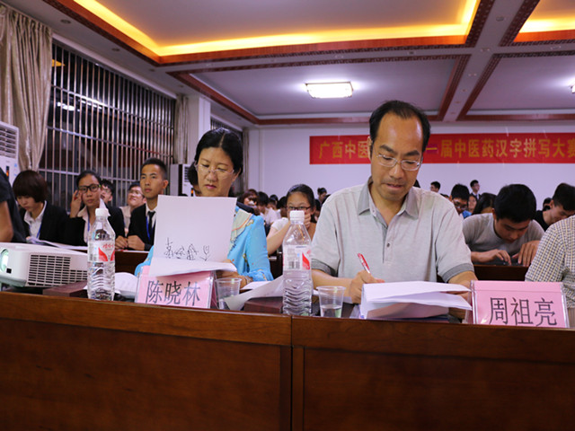 学校团委书记王春花、基础医学院院长林江、学工处副处长罗晓燕、学校教务处副处长韦维、基础医学院党委副书记龙春莉、学校党委宣传部理论科科长张国琳等领导、老师莅临决赛场地进行现场指导,本次大赛还有幸邀请到基础医学院医古文教研室主任周祖亮和学校语委办副主任、学校普通话培训测试站副站长、医古文教研室陈晓林老师担任评委。整个决赛分三个环节竞逐,分别为“争分夺秒”、“头脑风暴”和“谁与争锋”。来自学校不同学院的34名优秀选手组成五个小队进行角逐,分别有“杏林使者”、“白虎队”、“路路通”、“艾叶队”和“远志队”。在整个比赛过程中,“谁与争锋”环节更显激烈,利用转盘选出选手进行两两pk,优胜者可继续进行下一轮的角逐,而留在场上的最后一位选手即为本次大赛的状元。经过层层比拼,最后2013级中医学专业的孙伟平同学摘得“拼写状元”桂冠,2014中医学专业的岑艳芳等两名同学获得“拼写榜眼”称号,李雪珺等三名同学为“拼写探花”,曾丽莉等四名同学被评为“拼写秀才”,“最佳团体奖”根据全场表现最终花落“杏林使者”队。大赛最后,评委周祖亮老师对本次大赛进行了点评。他充分肯定了参赛选手的表现,也希望通过此次比赛可以提高同学们在中医药用字方面的认读、拼写能力和水平,期待今后在类似的比赛中同学们能有更加精彩的表现。