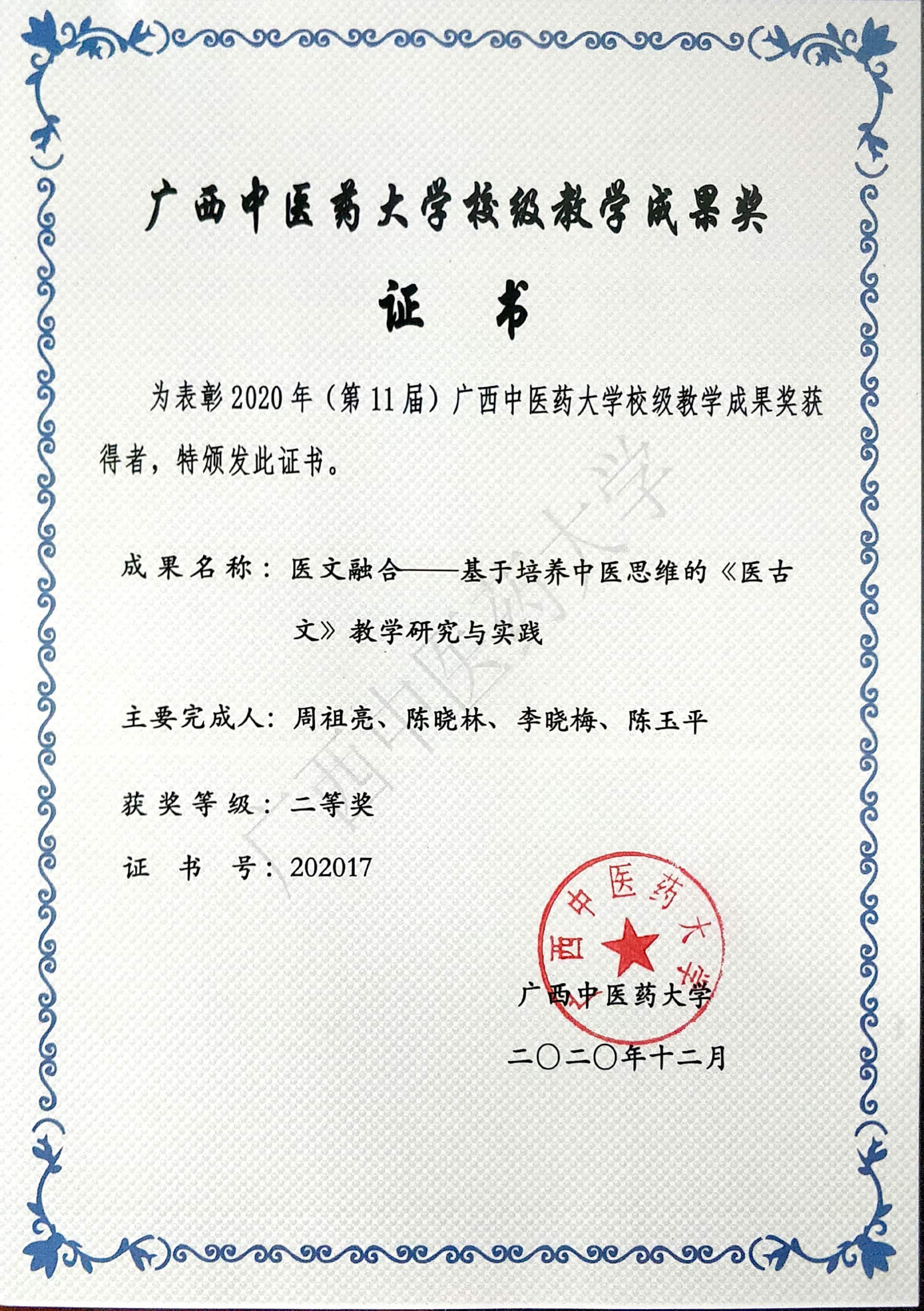 我教研室荣获第11届校级教学成果奖 来源:本站原创 作者:医古文教研室 发布时间:2021-12-07 15:07:14 浏览次数: 次 【字体:小 大】 近日,第11届beat365平台唯一官网校级教学成果奖评比结果公布,医古文教研室由周祖亮教授主持,陈晓林、李晓梅、陈玉平老师参与完成的教学成果“医文融合——基于培养中医思维的《医古文》教学研究与实践”荣获二等奖。 获奖证书(扫描件) 分享到: 【打印正文】