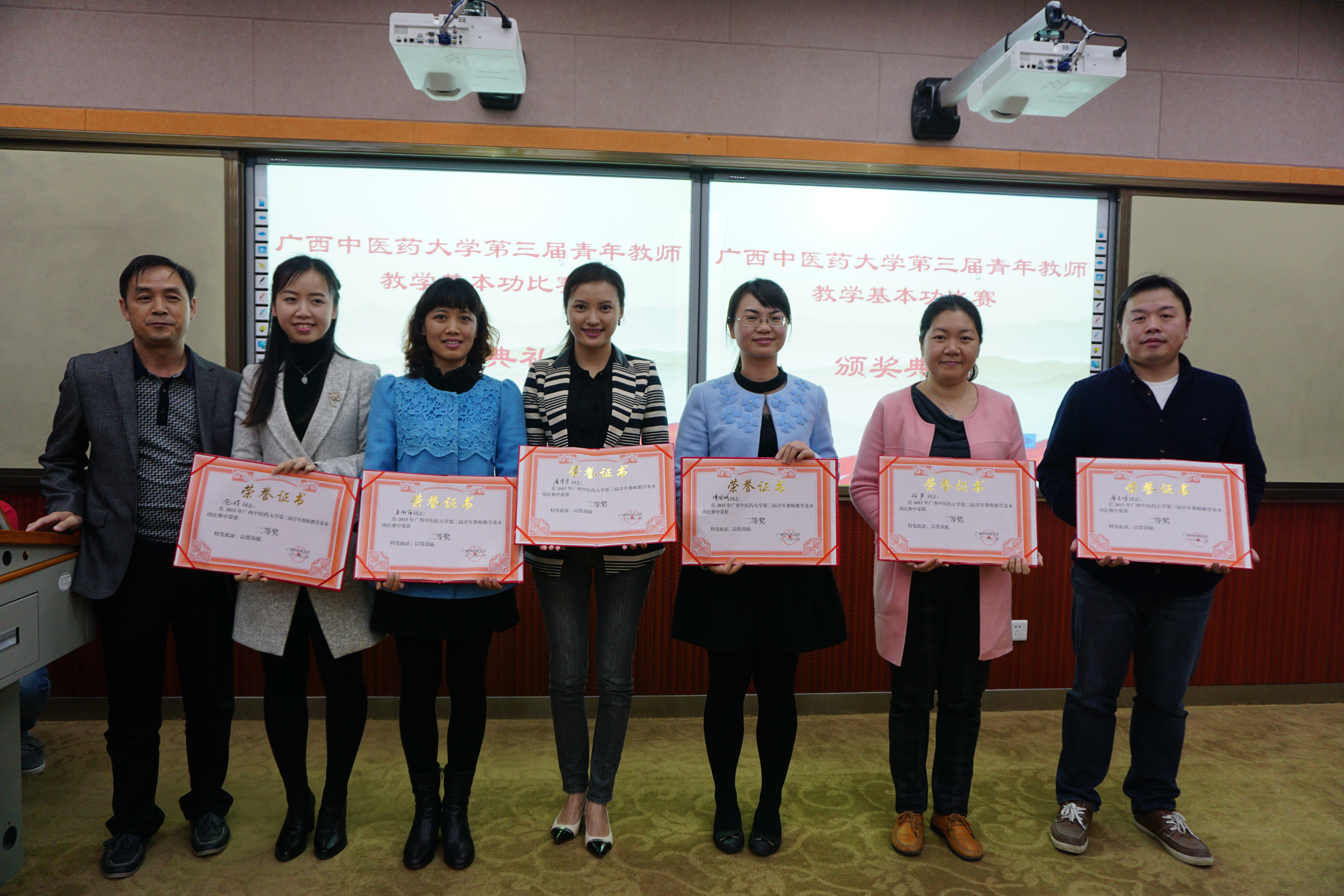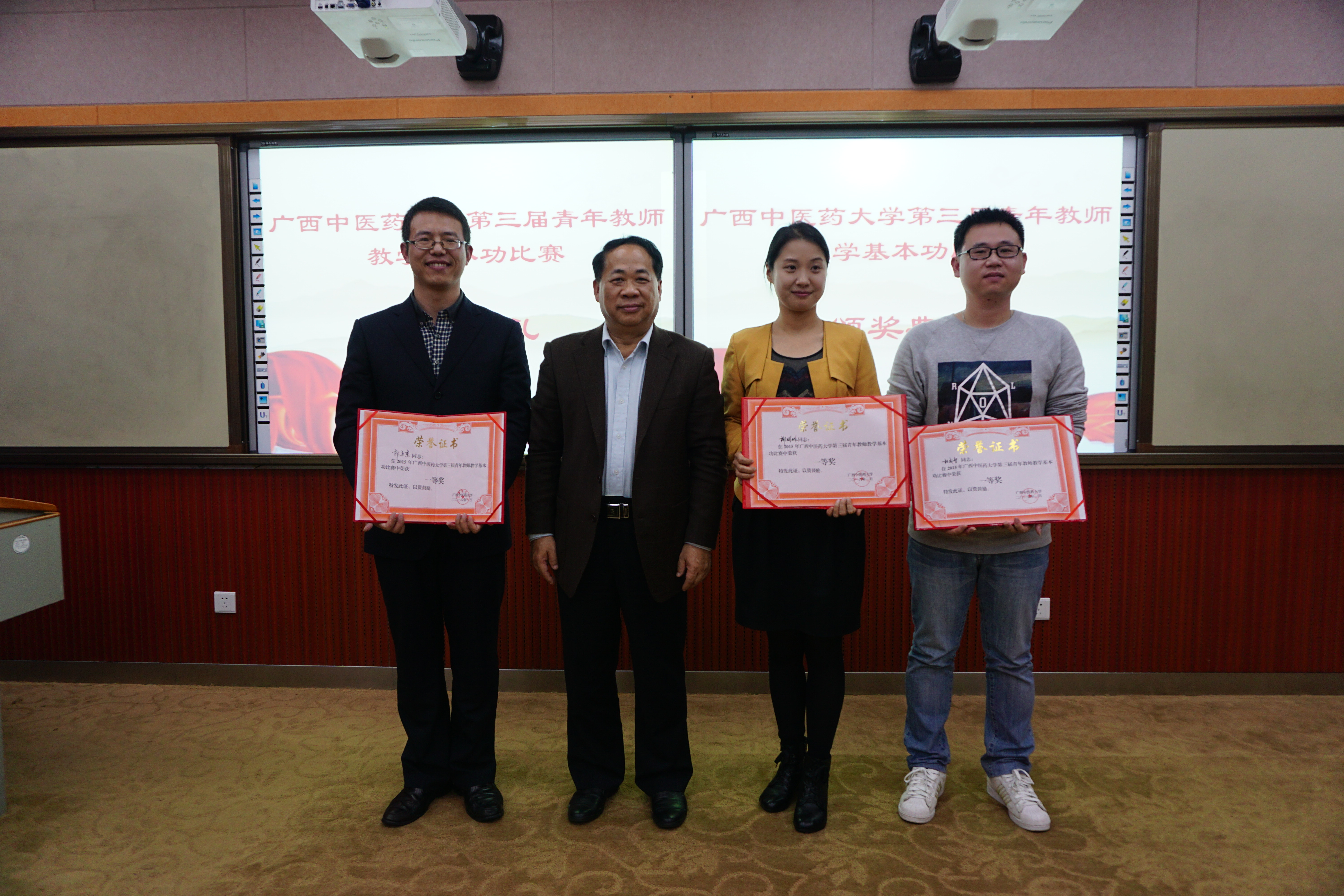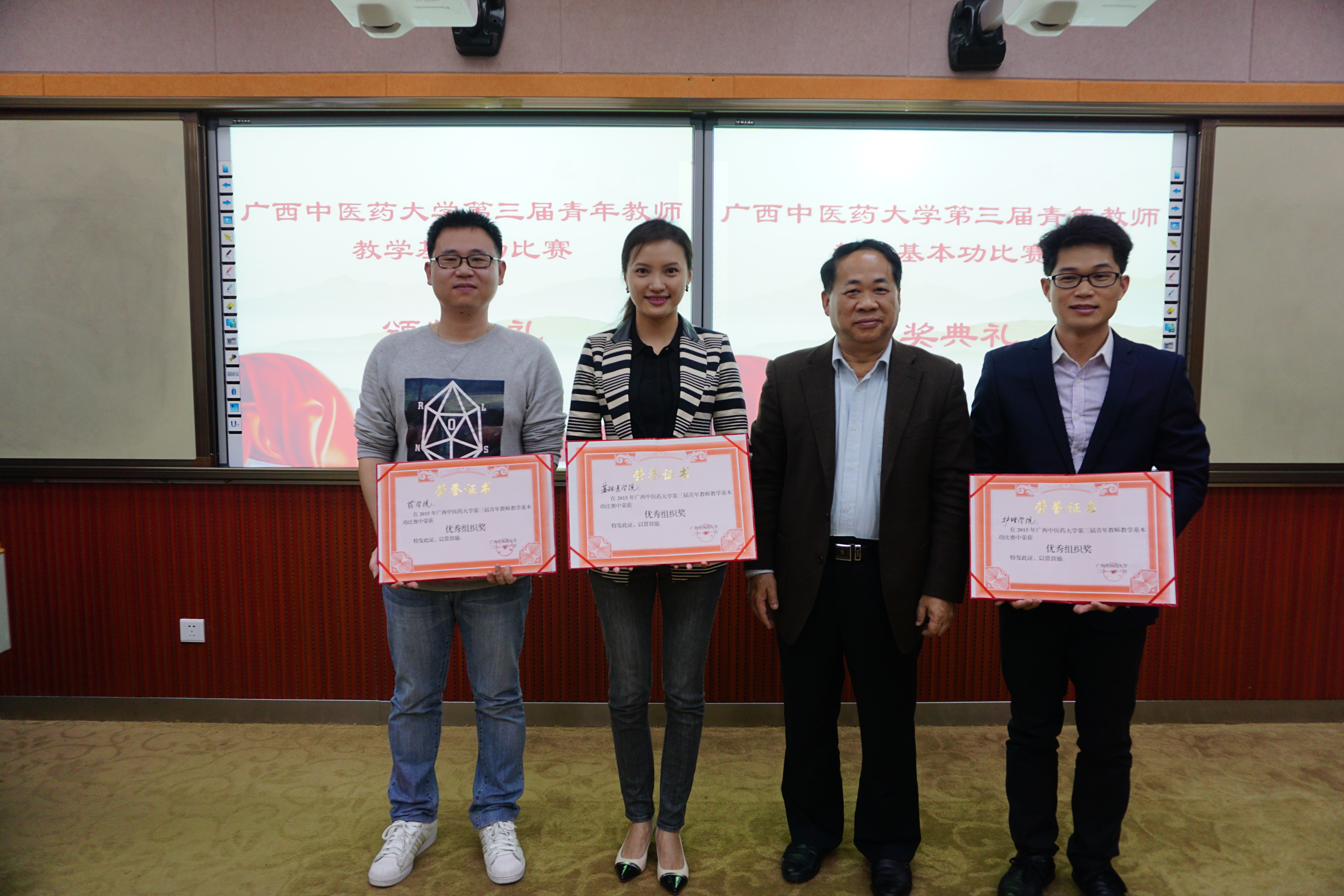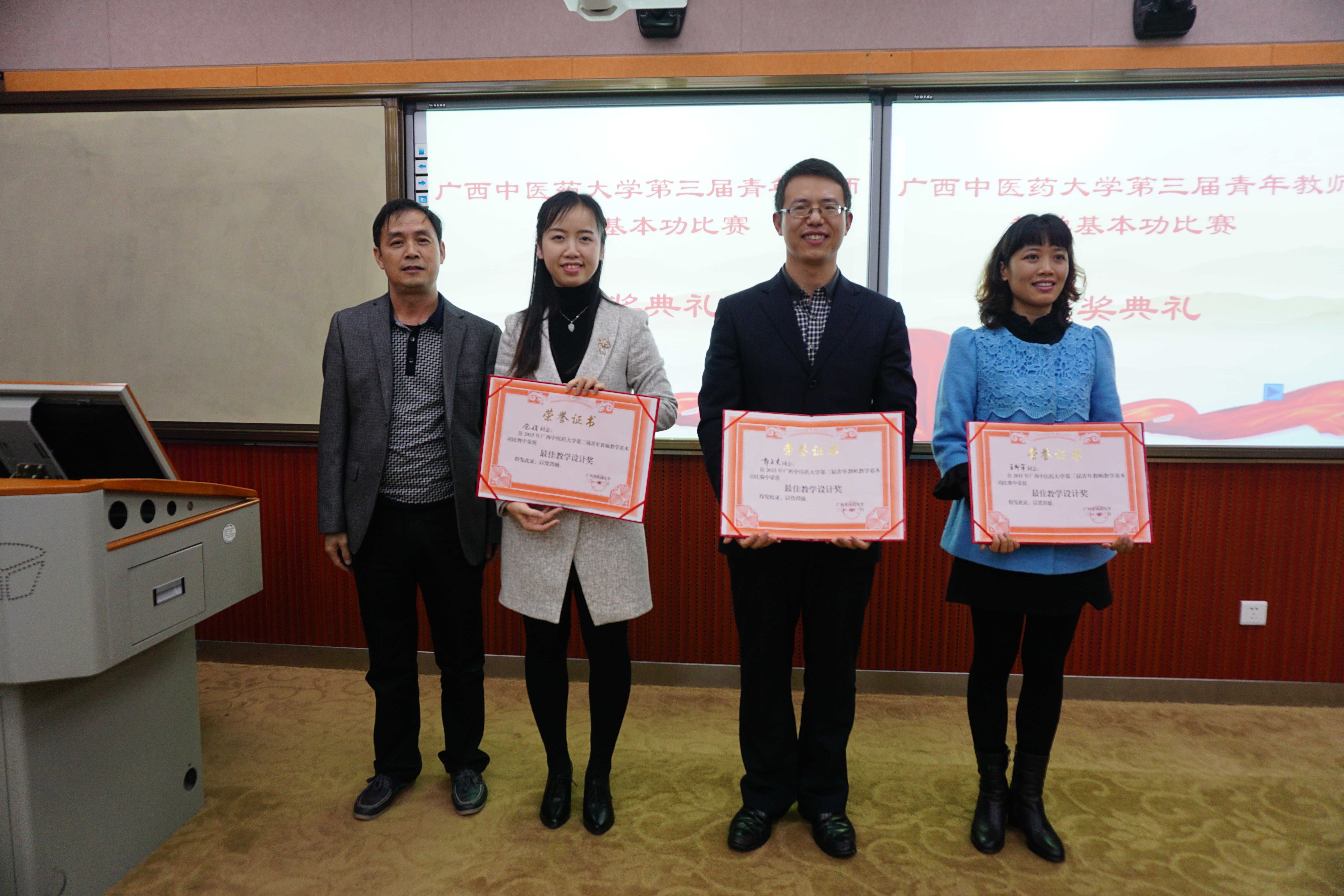 在颁奖仪式上,广西教学名师、校督导组副组长辛宁教授从教学内容、教学设计、教学方法、教学手段、语言教态、授课技巧、教学互动、教学艺术等方面对比赛进行了点评。广西教学名师罗伟生副校长也对比赛进行了点评和总结,他指出,beat365坚持举办青年教师教学基本功大赛,不断优化比赛规则、创新比赛内容,已使比赛成为beat365青年教师互相交流、学习和展示的一个重要平台,此次比赛赛制新颖,内容丰富,参与范围广泛,让许多青年教师得到锻炼,有效地促进了青年教师教育教学能力的提升,进一步调动了青年教师投身教学工作的积极性和主动性,达到了相互借鉴、共同提高的目的。但不足之处在于,参赛选手水平仍然参差不齐,部分选手缺乏经验;课件制作虽然精美但欠缺规范和标准,部分教师课堂互动不够,缺乏教学艺术。最后,罗伟生副校长还谈了几点感受,他认为将正确的教学理念和恰当的教学方法相结合是搞好教学活动的基础,全面发展不忽略每一个细节是在比赛中取得高分的基础,只有全面发展,全情投入,才能成为一名优秀的教师。