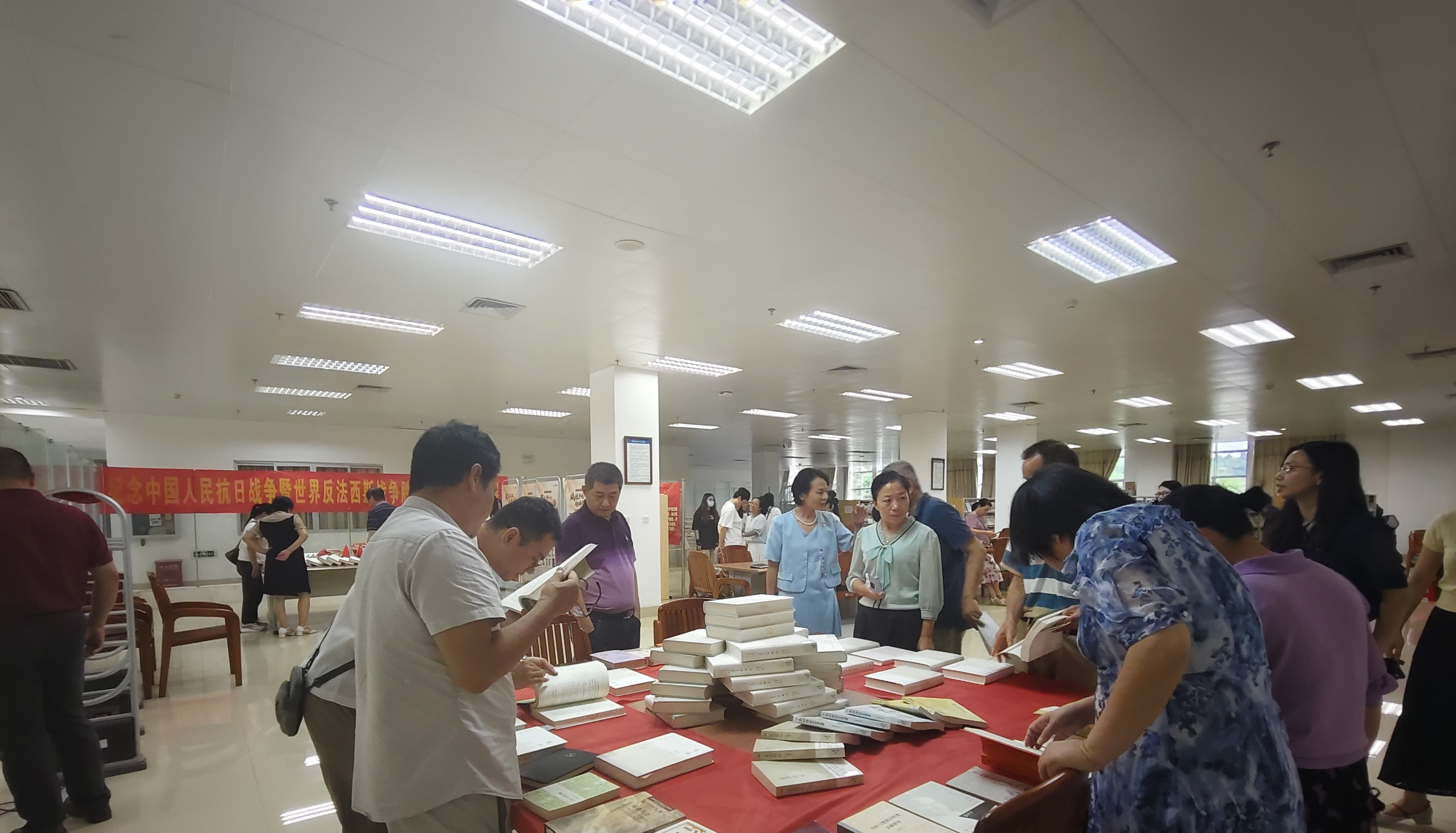 观礼结束后,图书馆全体职工来到二楼期刊部,参观“纪念中国人民抗日战争暨世界反法西斯战争胜利 80 周年专题书展”。展区精心布置了《复兴文库——抗战系列》《中国抗日战争正面全记录》《八年抗战》等学术著作及电子资料,通过丰富的图文内容,全面展现了中国人民抗日战争的全过程以及世界反法西斯战争的正义斗争。教学教辅机构党委、信息技术中心等部门负责人受邀出席活动并与馆员们共同参观展览。