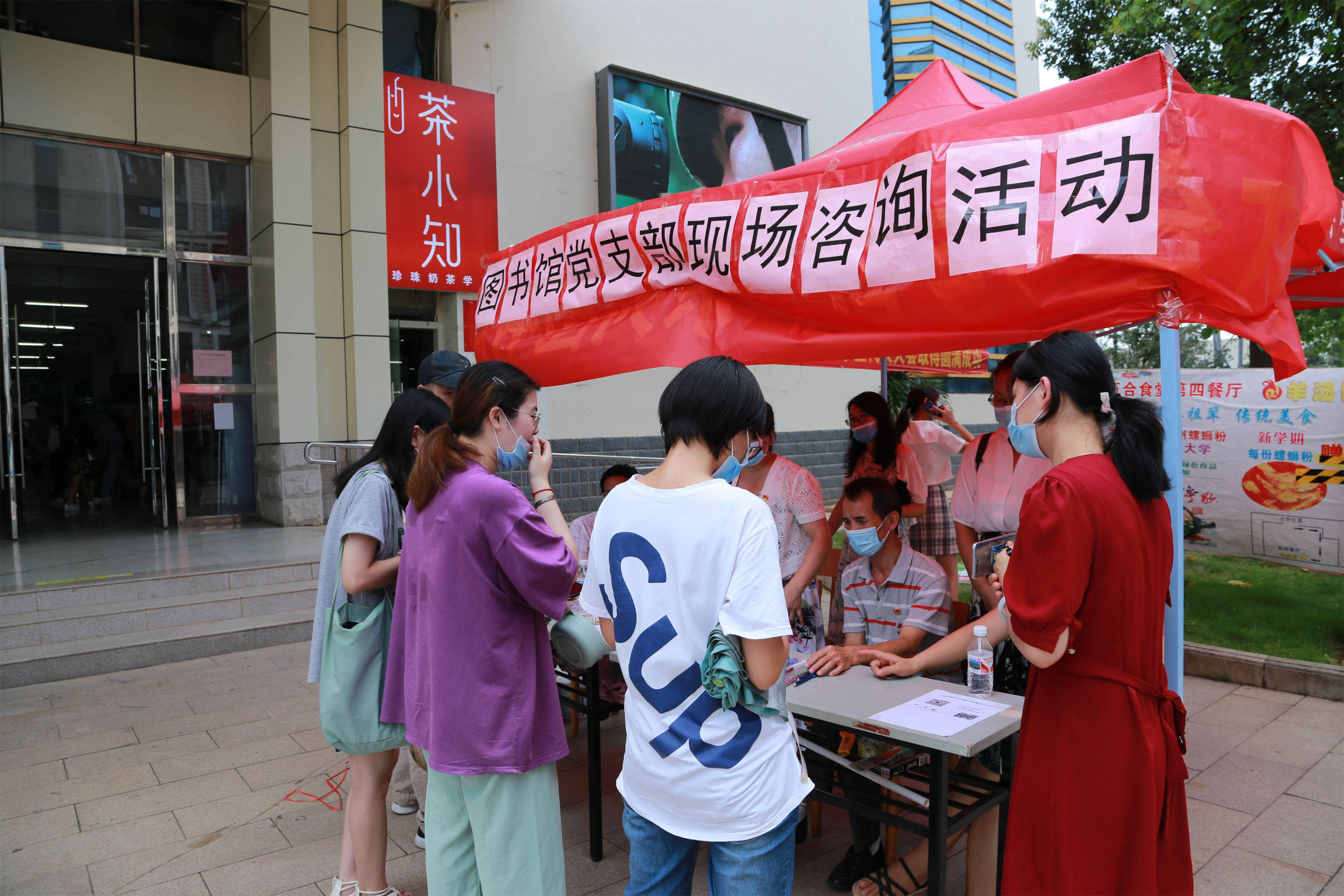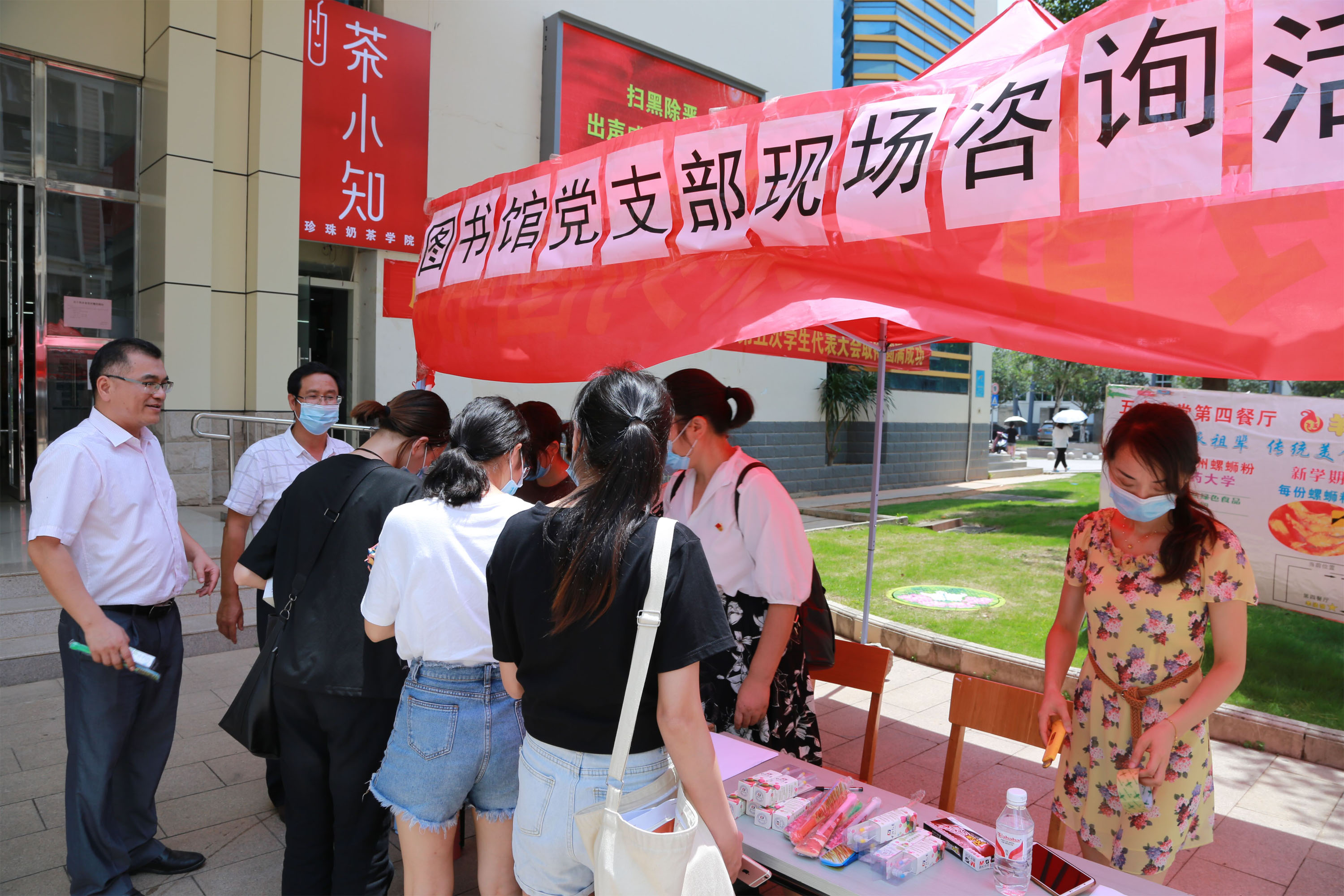 为更好地为广大师生提供优质的服务,为身边群众办实事办好事,以实际行动践行党员的初心和使命,在建党99周年纪念日,图书馆党支部利用午休时间在仙葫校区五和食堂门口广场开展了纪念建党99周年现场咨询服务主题党日活动。支部书记蒋才武带领图书馆党员志愿者参与了此次活动。