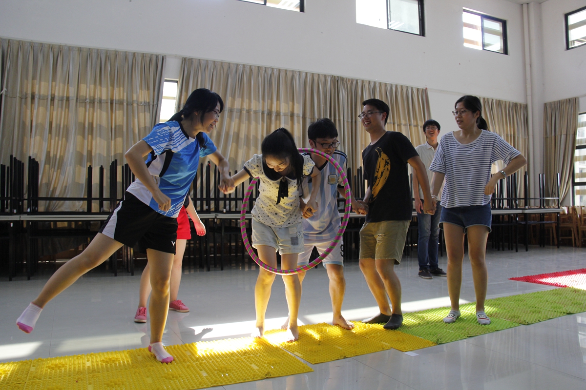 本次素质拓展活动有两个游戏组成:第一个游戏项目是丢沙包大赛,两个学院组合为一个分组,两两PK,计时两队队员存活时间,存活时间长的团队胜利,接到沙包可以复活任意一名队员,直至最后一名队员淘汰即游戏结束。第二个游戏项目是指压板追逐大赛,以学院或组织为团队两两pk,从不同的起点出发,经过跳绳,跨栏下腰,和钻过呼啦圈三个项目,本环节不计算时间,率先追到对方队员即为胜利。