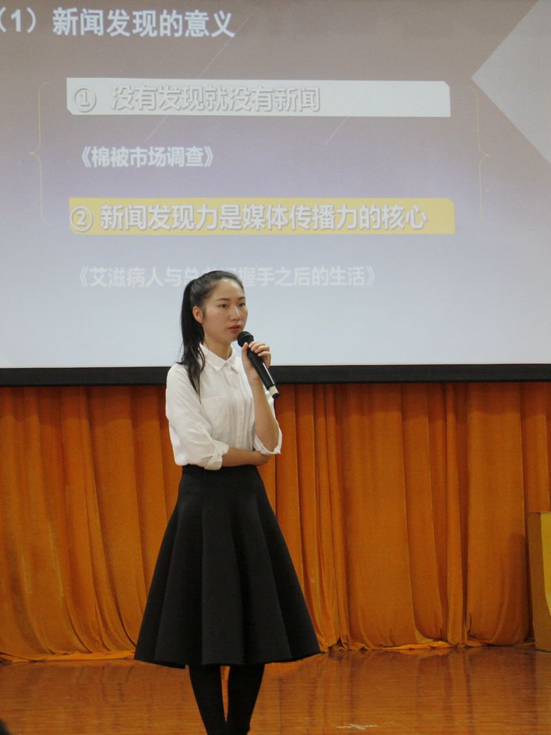 黄英老师以“什么是新闻?”为切入点,从自身的新闻写作经历出发,强调没有发现就没有新闻,为同学们讲解了新闻的分类、特点、消息的写作以及新闻摄影。在说到摄影时,她着重强调新闻摄影的构图以及新闻摄影常见活动拍摄,从会议现场、领导视察、文艺演出、体育活动和纪实类摄影五个实例进行讲解和分析。最后,黄英老师希望同学们“多读、多跑、多写、多改”,进一步做好新闻宣传工作。