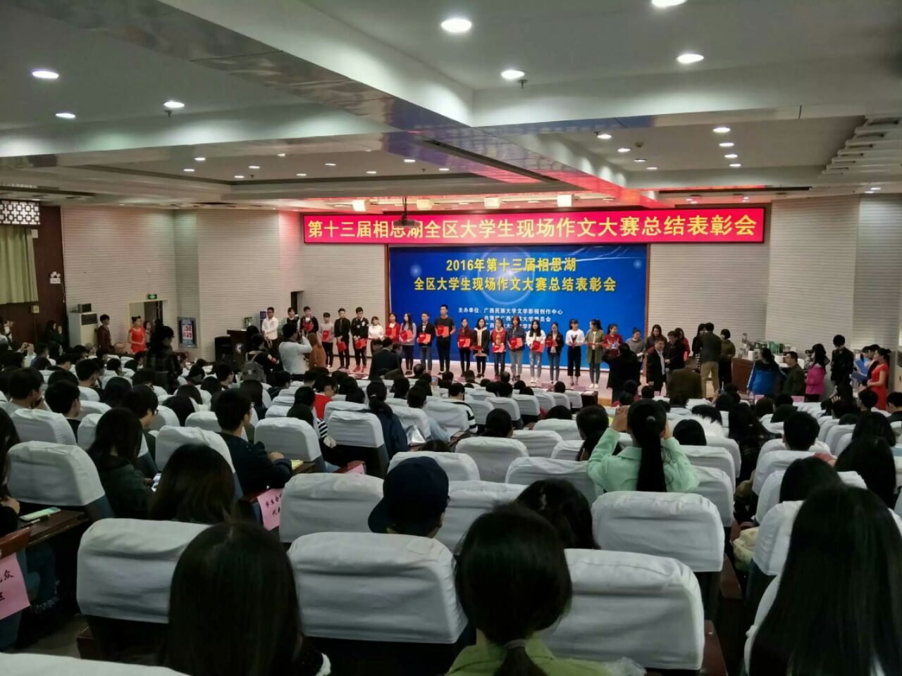 2016年12月10日,第十三届相思湖全区大学生现场作文大赛总结表彰会在广西民族大学隆重举行。beat365陈燕钦同学凭借《老三》斩获一等奖,李玉欣同学的《麦瑶与父亲》荣获三等奖,陈珊珊同学的《再也不在,不在也在》荣获优秀奖。同时,beat365大学生通讯社荣获优秀组织奖。