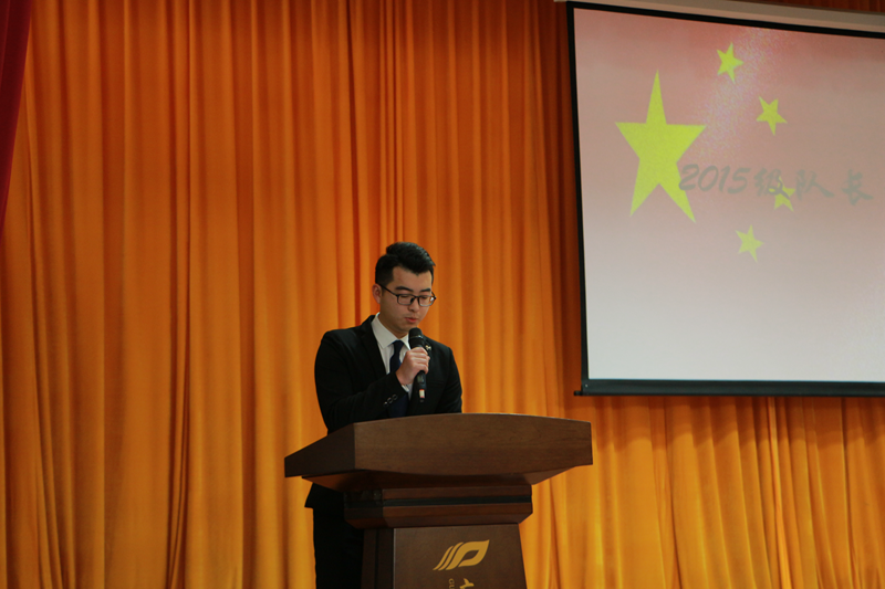 2015级队长吕玺发言,他指出,自进入国旗队以来,他们艰苦训练,努力提升自身素质,学校的日常以及周一全勤升旗都努力做到万无一失,不畏风雨,践行自己曾许下的誓言。大型活动出旗任务从不懈怠,为各大活动增光添彩。