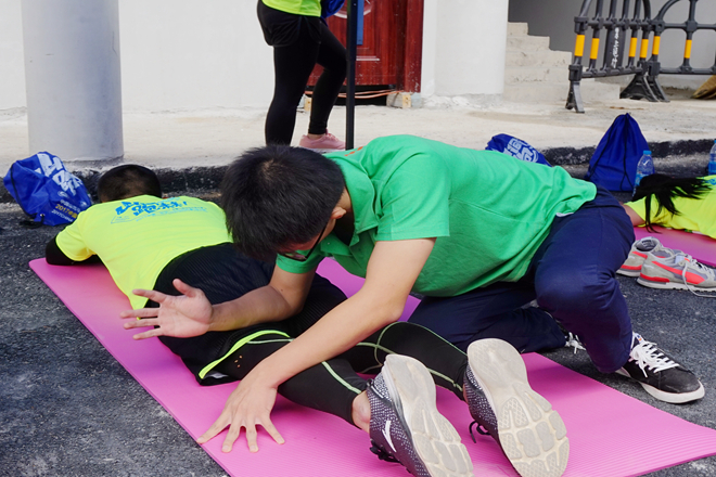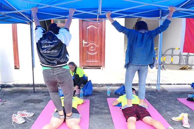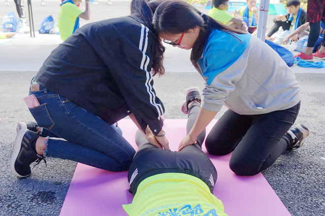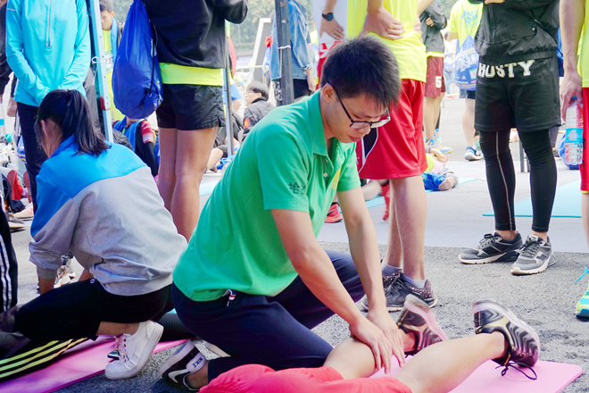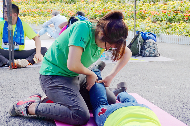 手协的伙伴们一对一地给参赛者进行赛后拉伸,按压等放松手法,还配合进行揉法、拿法、滚法、点法、拨法等手法按摩。为了使运动员能够得到更好的服务,手协伙伴们还做了传统中医治疗方法——踩跷。踩跷疗法是用双足节律性踩踏施术部位治疗疾病的方法,与其他的按摩手法相比,踩跷法具有作用力大、接触面积广、受力均匀、渗透性强等特点。经过一天的辛苦服务,运动员们对手协伙伴们赞叹不已,他们表示,“很感谢手协的同学们给我们提供这么棒的按摩服务,他们辛苦了。”