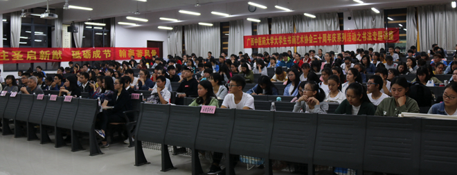 2017年11月8日19:30,大学生书画艺术协会(以下简称书画协会)于仙葫校区教学楼1-301顺利举行了国学进校园暨三十周年庆系列活动之书法专题讲座,旨在提高校园文化氛围,共庆书画协会三十华诞。出席本次讲座的嘉宾有广西硬笔书法协会主席莫振宁老师,书画协会指导老师黄卫生老师、庞邦君老师,书画协会第二十九届会长卢丽颖,第三十届会长刘昊辉,第三十届副会长兰秋敏以及各院校代表们等。群贤毕至,观书协水月临乡。