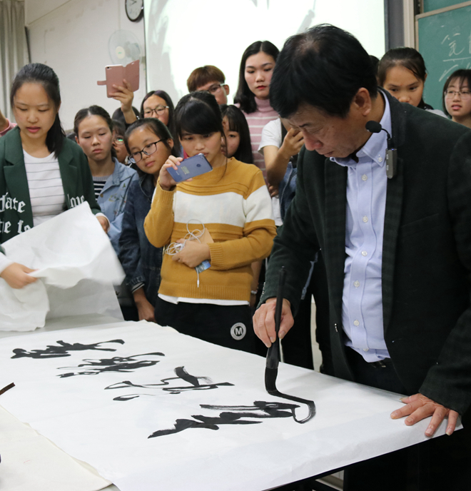 19:30分讲座正式拉开序幕。此次讲座分为三个环节:讲解环节、答疑环节和泼墨环节。莫振宁老师从书法欣赏方面展开演讲,谈到书法五法中的四法:笔法、字法、章法和墨法。他着重强调了章法和墨法的重要性:墨乃书法之助,墨法是书法艺术中一个重要的艺术表现手法和审美内容,而章法是书法创作的关键,是书法“字外功”的体现。同时也讲到了作品创作的要领和结构,谈及了如何在创作中调整笔风。老师声情并茂的演讲带动了全场气氛,各嘉宾代表和同学们都沉浸其中。答疑环节中有同学问到:为何写字时竖画写不好?老师表示:“写字要保持平和的心态,练字即练志,宁静则致远。意在笔先,才能下笔如有神;字里行间的讲究,才能错落有致。”老师的泼墨完美地演绎了“宁静致远”,大师手笔,挥洒千古,一笔一墨间为这次讲座画上了句号。