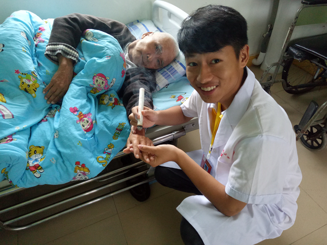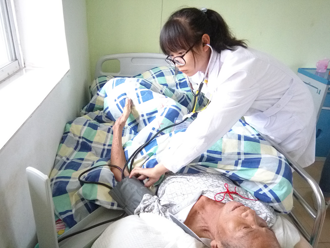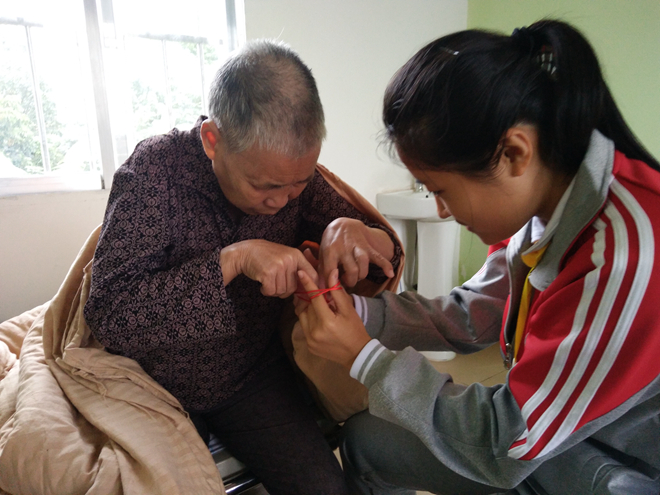 18日早上7:30,志愿者们集合,精神饱满地从仙葫校区出发。9:00,志愿者们到达曙光养老中心,敬老活动正式开始。志愿者们三俩结伴,一起去房间里探望老人。志愿者和爷爷奶奶们坐在一起聊家常,听老人们追溯当年的激情岁月。在与爷爷奶奶们聊天的过程中,志愿者们还精心为老人们缝制了手工小钱袋,做吉祥结。与此同时,义诊组也开始为爷爷奶奶们量血压、艾灸,帮助老人温通经脉、疏风散寒。在活动最后,志愿者们为老人演唱了歌曲《我的祖国》,唱到兴起时,老人不禁随着歌声打拍子,和起音。院子里传出阵阵歌声,气氛祥和。