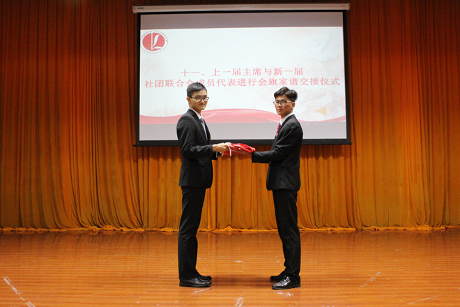 会议末尾,上一届主席与新一届社团联合会成员代表进行会旗家谱交接仪式。第三届社联主席庞康发言指出“社联社团本为一家,共谋一事,我们应当相互理解,互相帮助,团结一致,这样才能进一步增强社团的创造力、凝聚力和战斗力。”