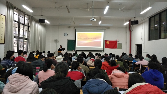 校团委书记王春花通过一个十九大知识小测试,了解同学们对十九大知识的熟悉程度,带同学们回顾了党的发展历程,为同学们阐述了党的十九大主题的深刻含义,及了解了党的十九大的“三大”重要成果。此外,还详细介绍了十九大精神的“六个新”:新时代、新思想、新使命、新征程、新期待、新蓝图。她结合自己的工作经历和个人思考,为同学们作了生动宣讲和深刻阐述,并与同学们互动交流。