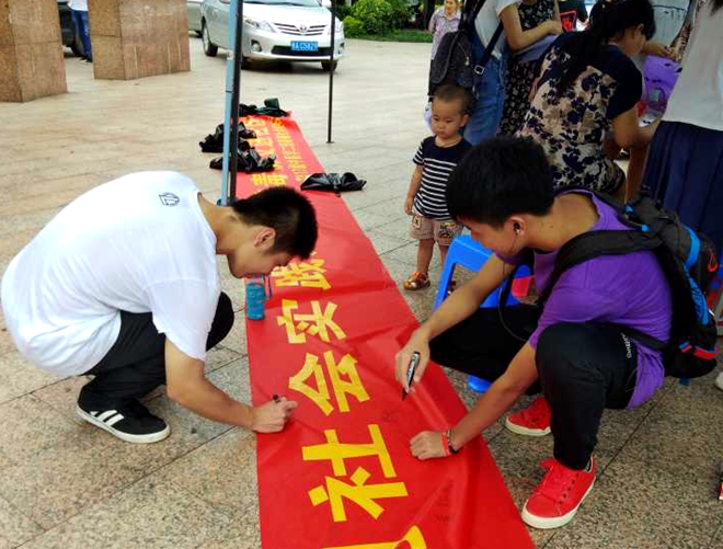 参与者在横幅上签名