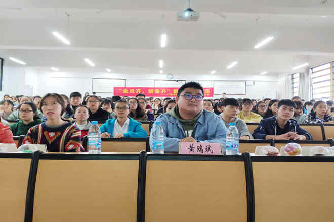 为提高同学们对毒品的认识并提高禁毒意识,营造无毒校园环境。beat365青年志愿者协会(以下简称“青协”)于2018年11月20日在beat365仙葫校区教学楼1-403开展了以“全员齐 禁毒行”为主题的禁毒知识宣传讲座,本次讲座有幸邀请到广西爱无疆社会工作服务中心副总干事黄瑞斌老师作为主讲人。