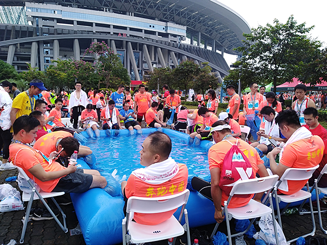 志愿者共分为两组,一组志愿者在比赛终点进行引导指引工作,另一组志愿者准备了较快速缓解痉挛的冷敷池和手法拉伸的帐篷区为运动员进行肌肉放松等工作。面对密集的运动员人群,志愿者们有条不紊地完成手中工作,细心询问运动员状况、指引冷敷池中运动员穿上脚套袋冷敷、为运动员进行肌肉放松等,根据运动员不同情况选择不同方法缓解运动员肌肉酸痛。