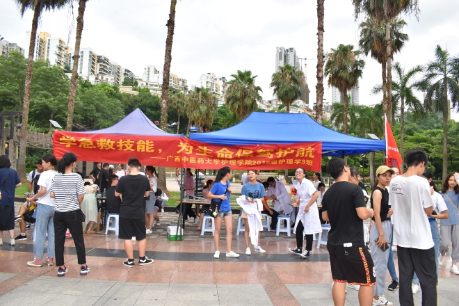 为响应团中央“青春心向党,建功新时代”的号召和beat365平台唯一官网关于进一步加强大学生暑期社会实践活动有关要求,2019年7月5日下午,2018级护理学3班在南宁市青秀区天池山广场开展了以“学急救技能,为生命保驾护航”为主题的暑期社会实践活动。班主任葛圆老师作为指导老师带领2018级护理学3班79位同学参加此次活动。