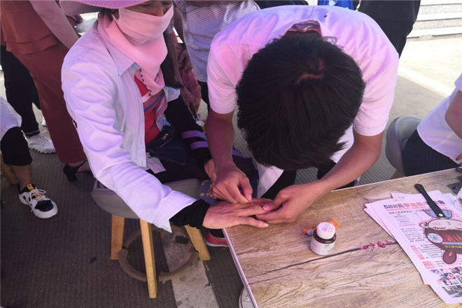 在活动过程中,成员们都很用心的为到来的叔叔阿姨及同学们提供服务,在了解他们基本身体情况的基础上,提供治疗帮助及提一些对其健康有利的建议。并且因为很多人对药线点灸好奇已久,更是选择了我们的“一条龙”服务,如先在前面量血压,再去感受手法治疗和药线点灸的魅力。