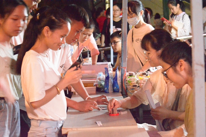 夜幕降临,花灯的色彩更加鲜艳,车水马龙的人群还在不断的涌入。同学们还是井然有序的排队在各个摊位前参与游戏,现场热闹的场面惹得路过的行人也纷纷驻足观望。