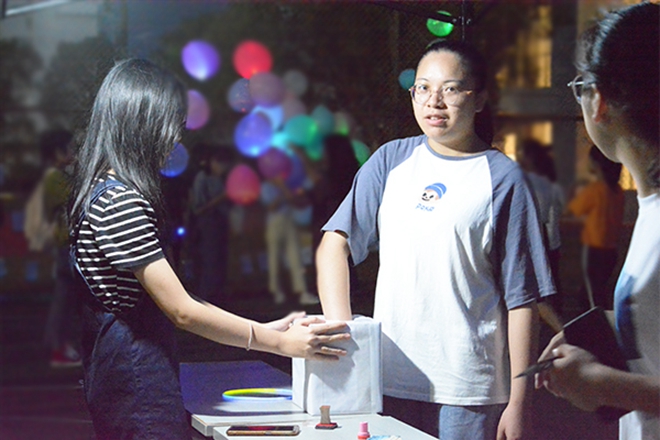 绚丽多彩的花灯、热闹非凡的人潮营造出热闹喜庆的节日氛围。本次游园活动设有赏花灯和趣味小游戏两大模块。现场游戏环节有“猜灯谜”、“就不听指挥”、“爱的魔力套圈圈”、“魔力弹球”、“运气大比拼”、“幸运硬币”,同学们需要通过参与小游戏获得相应的盖章后,到兑奖处抽取精美小礼品。