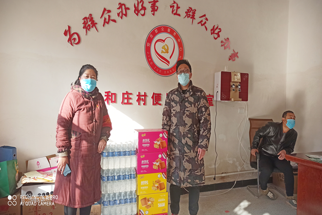 基层疫情防控工作复杂、艰巨,条件相对简陋,遇到寒冷天气就燃起火堆取暖,双手双脚一天下来基本处于麻木状态。与和卫宾老师一起执勤检查都是村里精壮青年,兼顾家庭和农活,任劳任怨,尽心尽责,为的就是保护好一方水土,守护好村子里父老乡亲。由于全村参与志愿服务工作人员较多,执勤时间久,每天村里会为各个站点送上有限几瓶水和面包。和卫宾老师有一天和执勤人员聊天得知村里站点生活物资紧缺,他就第二天不吭声响,骑着电动三轮车在一家超市购买四件矿泉水和五箱蛋糕等物资,直接拉到村委会便民服务室,为村里疫情防控站点送上一些生活保障物资,认真履行着一名党员义务,献上一份爱心。