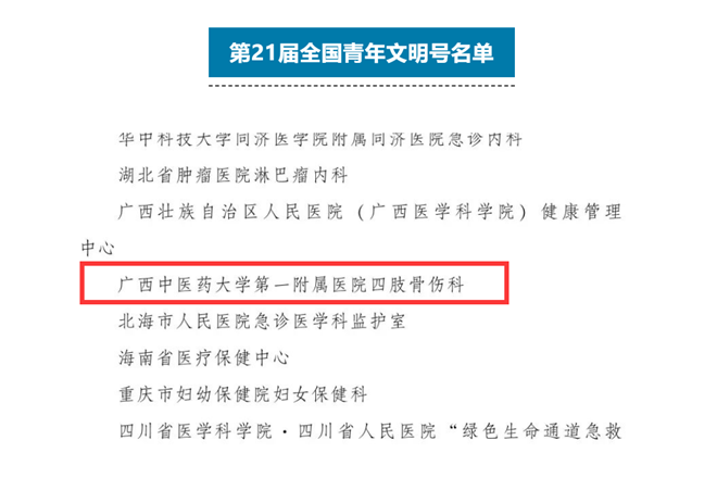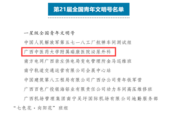 2023年9月19日,第21届全国青年文明号评选结果揭晓,共有1932个集体被评选为“第21届全国青年文明号”,其中有709个集体被评选为首批“二星级全国青年文明号”和1223个集体被评选为“一星级全国青年文明号”。beat365有三个集体上榜,beat365第一附属医院四肢骨伤科获二星级全国青年文明号称号,附属国际壮医医院风湿病科、附属瑞康医院泌尿外科获一星级全国青年文明号称号。