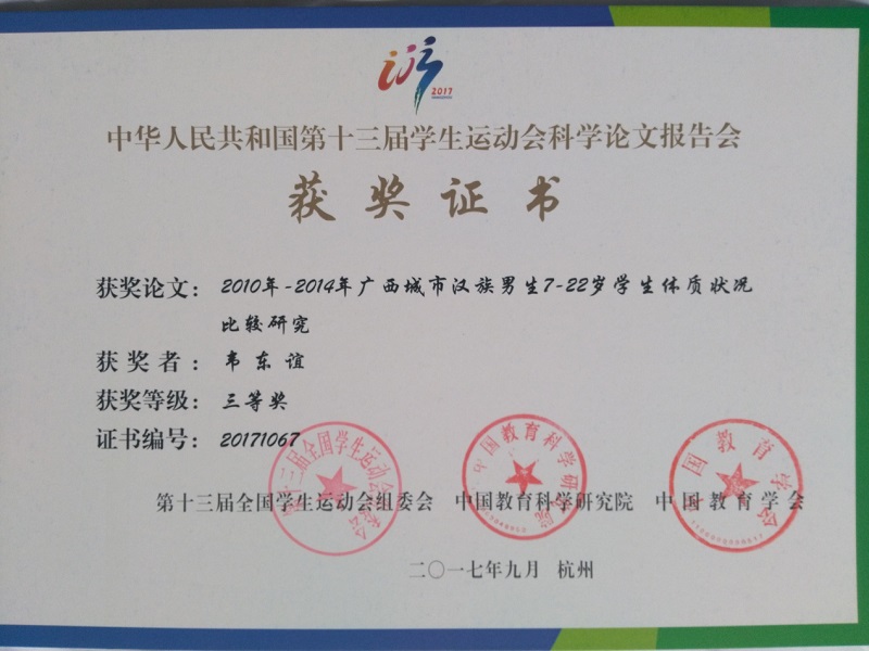近日,由教育部、国家体育总局、共青团中央主办,浙江省人民政府承办,中国教育科学研究院、中国教育学会全国高等学校体育教学指导委员会、全国中小学体育教学指导委员会协办的第十三届全国学生运动会科学论文报告会在浙江工商大学举行。beat365体育部韦东谊老师报送的论文《2010年-2014年广西城市汉族男生7-22岁学生体质状况比较研究》紧跟学生体质健康的热点问题,数据全面,分析到位,观点独特;吴国天老师报送的论文《微信公众号在高校足球教学中的实践应用》紧抓校园足球和互联网+当前这一最热门的学校体育研究课题,有理论分析,有实践应用,两位老师同获三等奖,beat365论文获奖数量名列广西高校第二位。