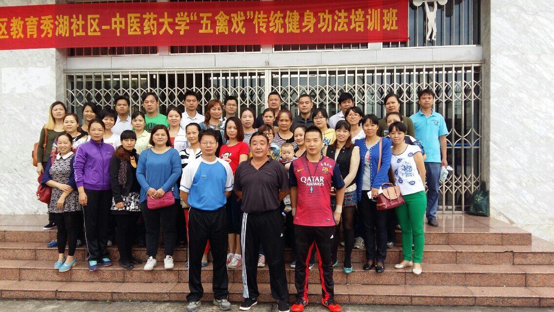 “五禽戏”开班仪式上,中医药大学体育部兰书记、林主任,秀湖社区黄益斌副书记和热情的居民朋友合影留念。