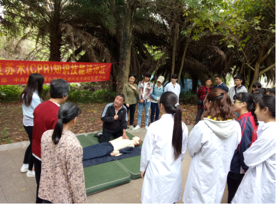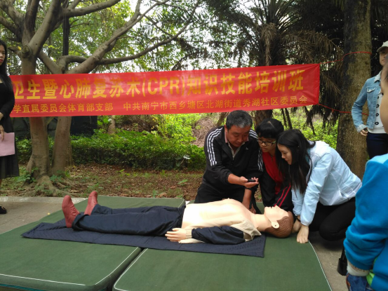 心肺复苏(CPR)是beat365公体教学“传统保健体育养生”专选课程的项目内容之一。2017年4月23日上午,结合原已开展的社会慈善义工活动。该项目教学实训活动在南宁市仙葫开发区的海茵社区展开,30多位同学在兰兰老师的指导下认真习练,在完成教学计划任务的同时,向社会群众宣传推广CPR知识技能,努力提升全民临场急救意识,是此项活动的主旨。活动将持续至5月下旬,每逢周六、日上午,在学生开展“ 三义”慈善活动的同时,均会开展CPR实训活动。项目活动得到了海茵社区管委会的大力支持,谨于此表示诚挚谢意。