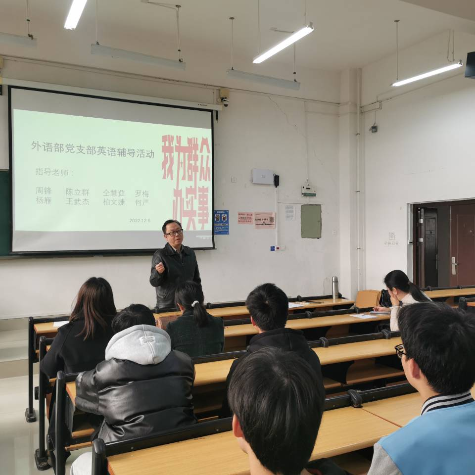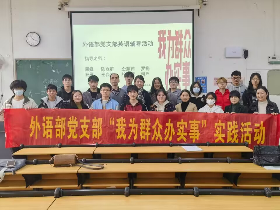 为深入学习贯彻党的二十大精神,2022年12月6日下午,外语部党支部在教学楼1-108教室开展“我为群众办实事”英语辅导活动,活动由组织委员罗梅主持。
