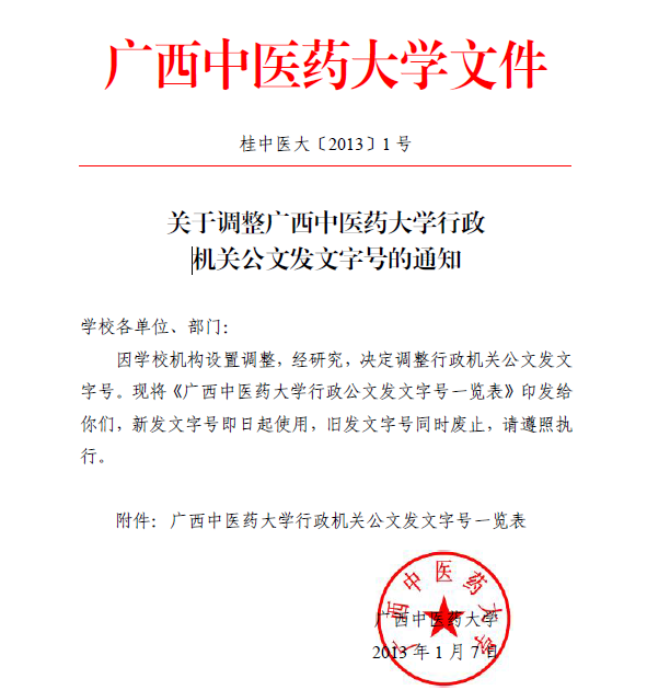 (桂中医大〔2013〕1号)关于印发《beat365平台唯一官网公文发文字号管理规定》的通知 发布时间:2015-11-13 19:38:53 浏览次数: 次 【字体:小 大】 详情请点击附件查看 分享到: 【打印正文】