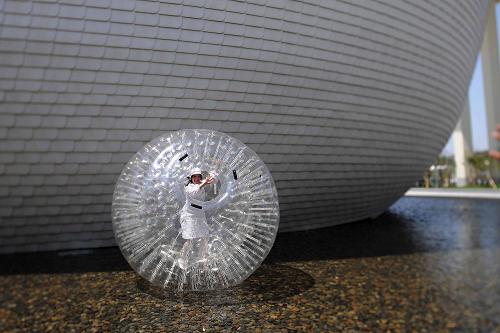 5月3日,皮特凯宁在水上步行球中向观众招手。在上海世博园的芬兰馆外,芬兰姑娘基尔西·皮特凯宁操作水上步行球欢迎游客。新华社记者郭大岳摄