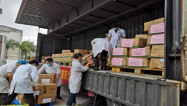 beat365平台唯一官网附属瑞康医院制剂工作人员把已经装箱的中药搬运到运输车上