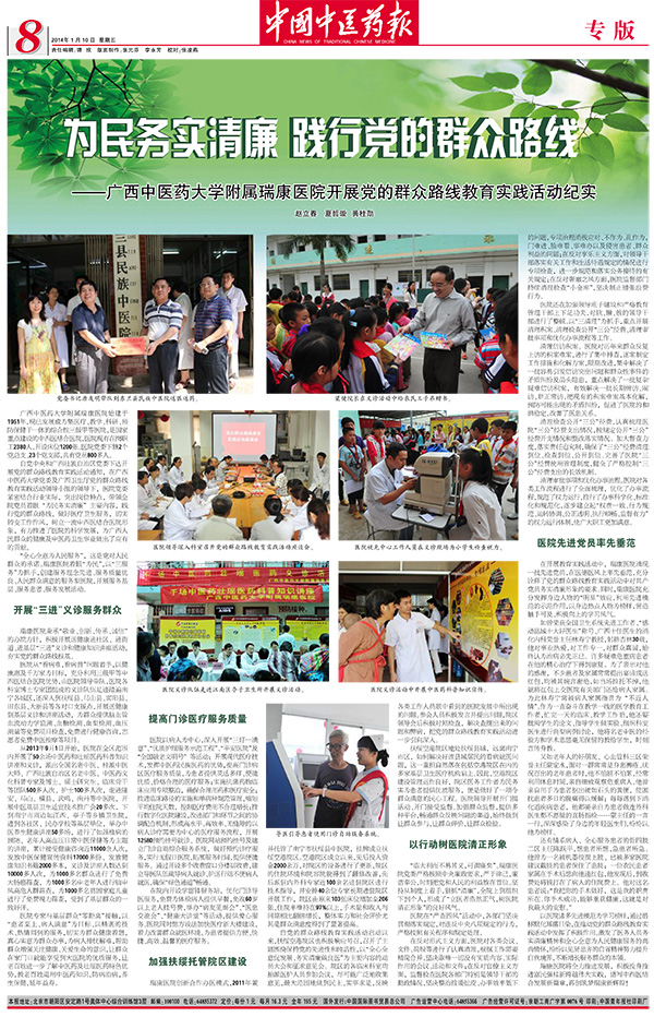《中国中医药报》是国家中医药管理局主管的中医药行业唯一的权威性大报,其发行覆盖全国20000家医疗机构,近1000家卫生教育、科研机构,数千家医药企业、医疗器械企业、保健品企业,20000家药店和近10万大众订户,不仅是医疗行业的大型专业媒体也是大众喜闻乐见的健康读物。该报于2014年1月10日在第八版对瑞康医院开展党的群众路线教育实践活动情况进行了专题报道——《为民务实清廉 践行党的群众路线——beat365平台唯一官网附属瑞康医院开展党的群众路线教育实践活动纪实》。