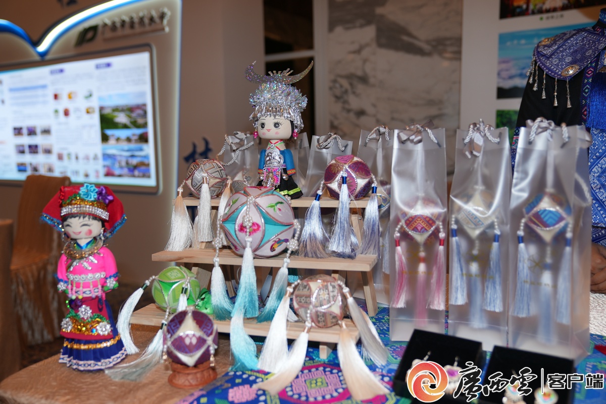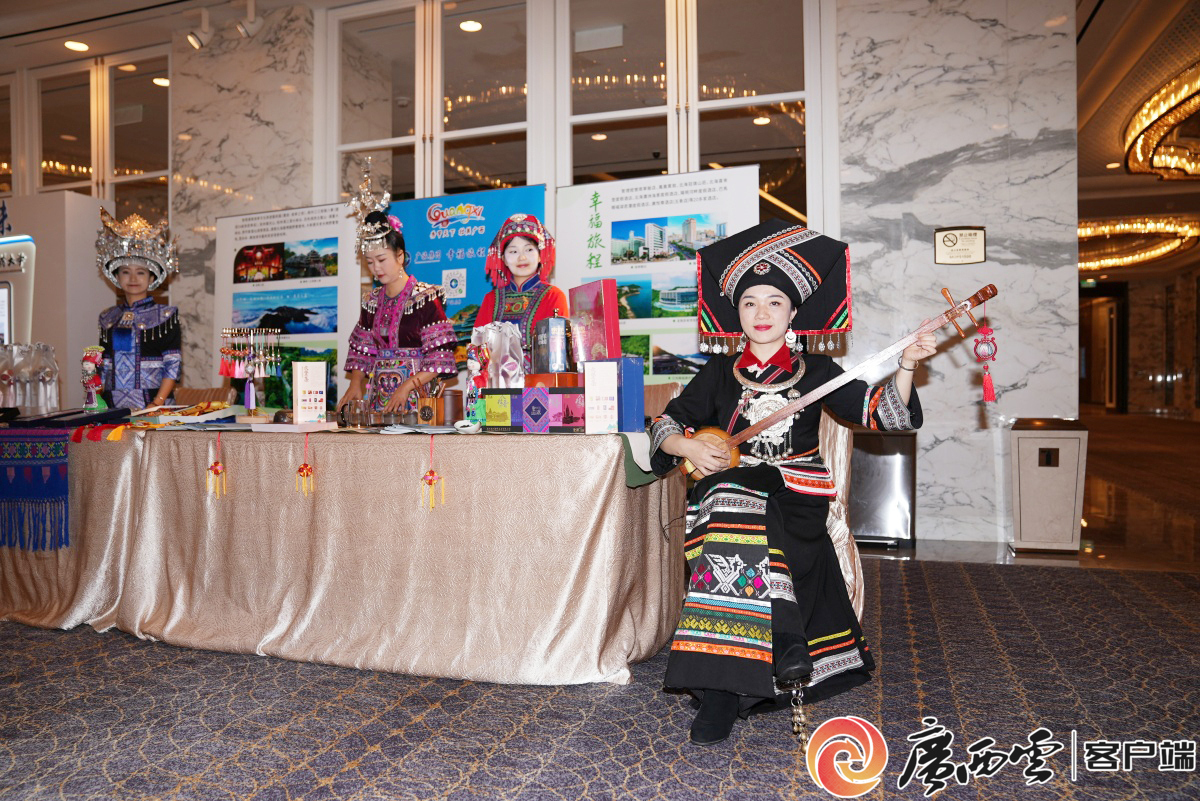在广西旅游发展集团精心布置的展台前,身穿少数民族服装的女孩向嘉宾介绍广西秀美的山水风光、精美的文创产品,歌手弹唱着广西山歌,吸引了众多嘉宾。
