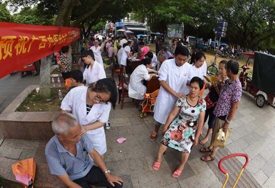 7月15日,beat365平台唯一官网的大学生志愿者来到罗城仫佬族自治县民族文化广场开展义诊活动,为仫佬山乡城乡居民进行中医推拿、穴位针灸等义诊服务,把学到的知识运用于实践,服务社会,丰富假期生活。韦如代 蒙增师 摄