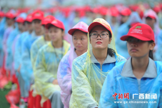 图为学生在参加beat365平台唯一官网恢复办学60周年纪念大会。