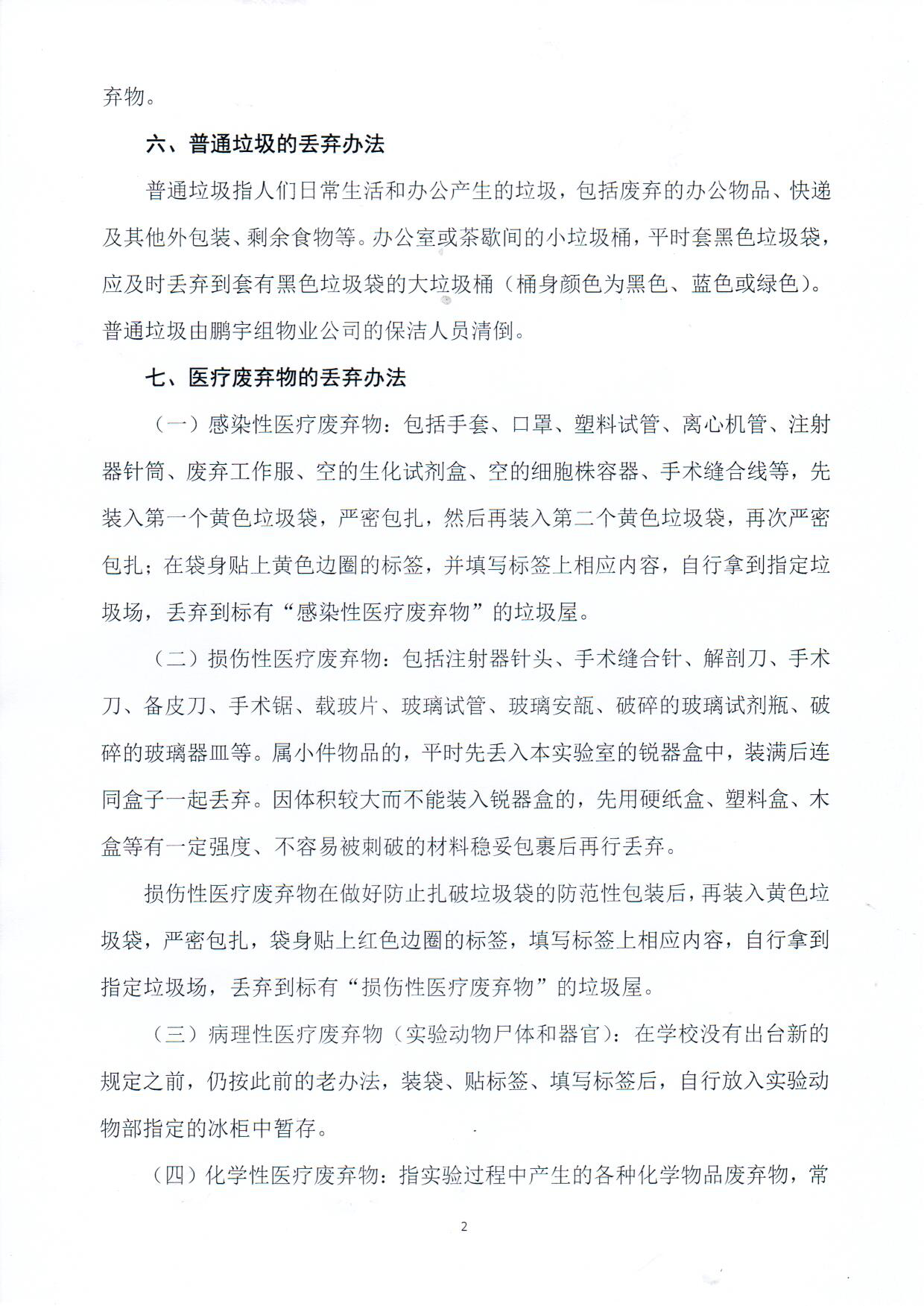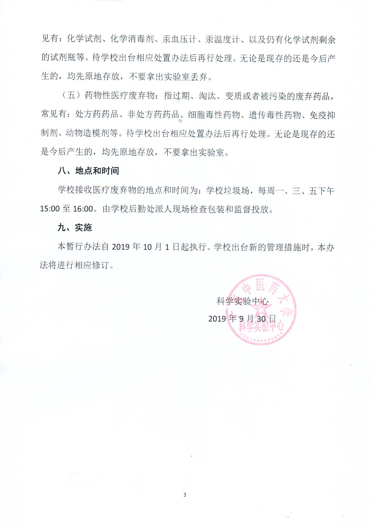 科学实验中心关于施行《实验室废弃物处置办法(暂行)》的通知 来源:科学实验中心 作者:陈柏承 日期:2019-09-30 点击数: 次 分享到: 各有关实验人员:根据学校领导相关工作部署以及后勤处《关于医疗废弃物回收的通知》要求,科学实验中心领导高度重视,立即组织各部门主要技术骨干和负责人,通过反复论证和商讨,初步制定了《科学实验中心实验室废弃物处置办法(暂行)》,对实验室废弃物的分类、包装、贴标签及丢弃流程进行了明确规定,并于2019年10月1日起正式执行。具体办法如下:附件:科学实验中心关于施行《实验室废弃物处置办法(暂行)》的通知 打印正文 关闭本页