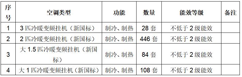 三、设备数量:666台 牌空调设备及其附属设备,具体为:空调规格:大1匹108套:大1.5匹84套;2匹446套;3匹28套,均为空调冷暖型两用,含电辅热,壁挂式空调。空调必须具有国家节能产品认证证书,能耗等级不低于新2级。冬、夏季室外温度按《民用建筑供暖通风与空气调节设计规范》GB50736-2012扏行:夏季34.5℃,冬季3.5℃。室内设计温度(关门关窗):夏季26℃,冬季20℃。具体设备如下: