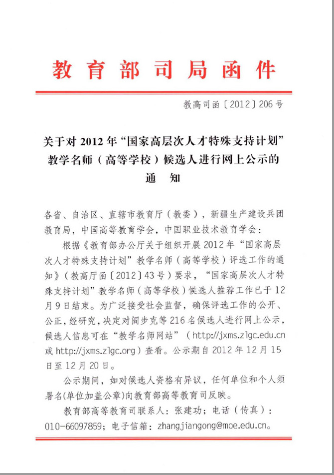 关于转发《关于对2012年“国家高层次人才特殊支持计划”教学名师(高等学校)候选人的进行网上公示的通知》的通知 来源:宣传部 作者:宣传部 日期:2012-12-14 点击数: 次 分享到: 打印正文 关闭本页