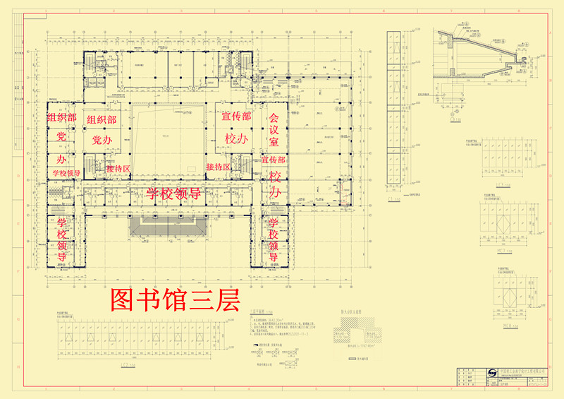 三层:图书馆机房、多媒体演播室、学校领导、党办、校办、组织部、宣传部、会议室、接待室。