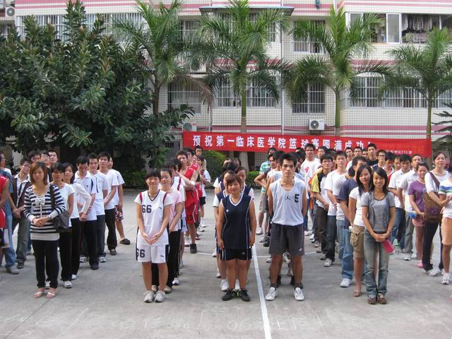 2009年10月17日下午17:40,为响应第十一届中华人民共和国全国运动会“全民参与”号召,广西中医学院第一临床医学院在广西中医学院第一附属医院第一生活区篮球场举办了以“发展体育运动,增强人民体质”为宗旨的高年级篮球赛开幕式。参加本次比赛的参赛队有05对外、06中医一大班﹑06中医二大班、06口腔、06传统、06壮医及06针推,且各参赛队均为男女混合队伍。出席本次开幕式的嘉宾有第一临床医学院教学党总支专职副书记覃国智老师、教学部、学工部副主任林强老师、第一临床医学院团委书记肖易老师等。