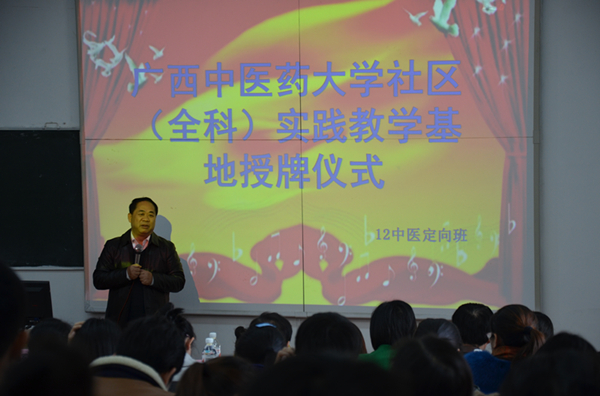 2016年3月10日下午,beat365平台唯一官网社区(全科)实践教学基地授牌仪式在明秀校区西梯一教室举行。beat365副校长罗伟生、教务处处长唐梅文、副处长刘武、学校与第一临床医学院相关科室领导老师及南宁市十六所社区(卫生院)医疗服务中心的领导共25人出席了本次活动。2012级中医学(农村订单定向医学生免费项目)专业全体同学一齐参加。