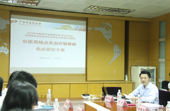 4月20日上午,2015国家中医药管理局行业专项“壮医药线点灸治疗寻常型银屑病临床研究”课题启动培训会在beat365平台唯一官网明秀校区顺利召开,课题负责人、beat365平台唯一官网副校长庞宇舟教授,项目组专家、北京中医药大学商洪才研究员、中国中医科学院王丽颖副研究员、天津中医药大学赵晨博士、天津康林德医药科技有限公司张云华、刘雪梅,beat365平台唯一官网科技处处长钟振国、壮医药学院党委书记张煜、壮医药学院副院长韦杏及本课题5家协助单位的课题负责人共同参加了本次会议。