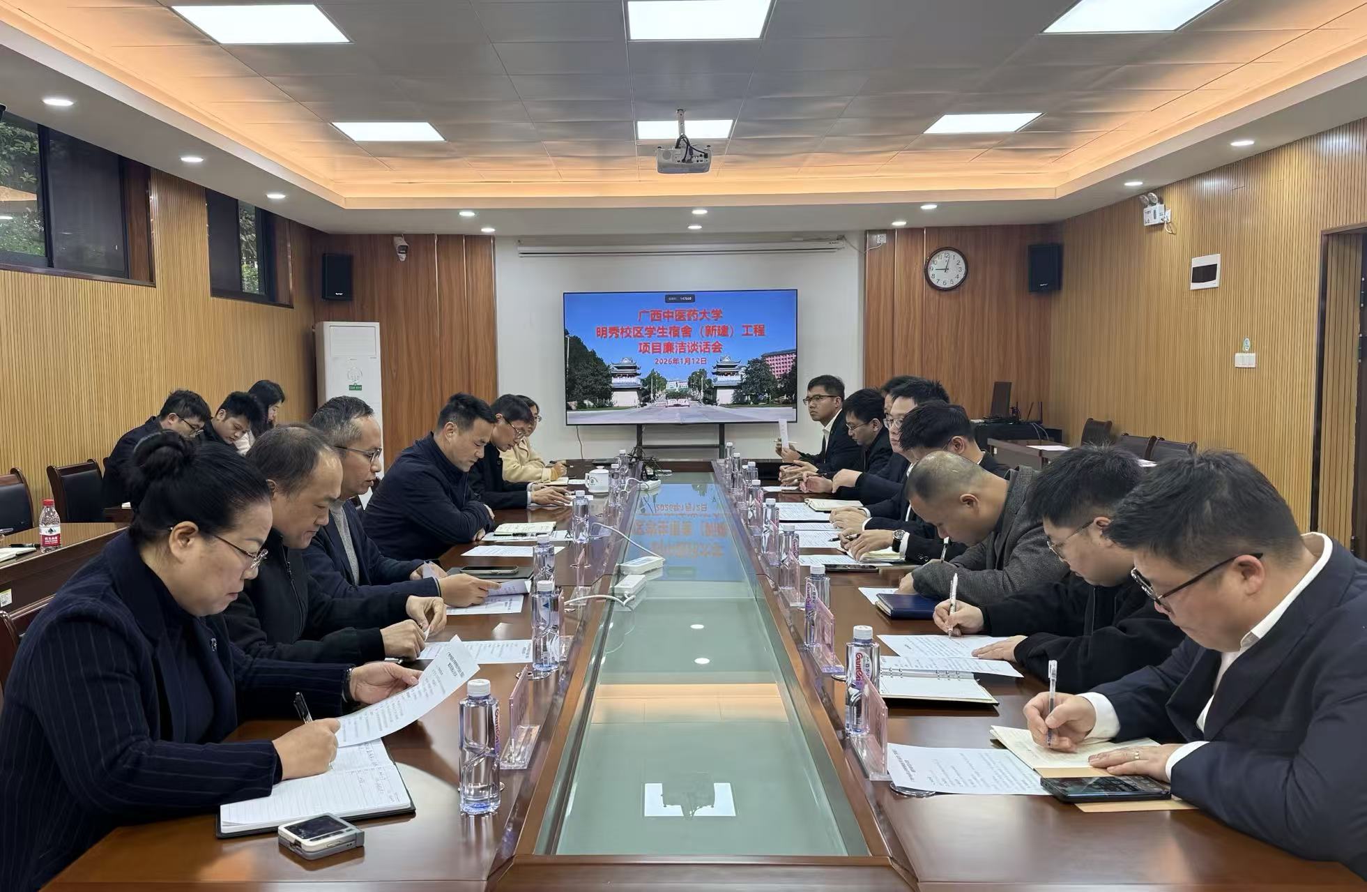 1月12日,学校召开明秀校区学生宿舍(新建)项目廉洁谈话会,自治区纪委监委驻beat365平台唯一官网纪检监察组副组长、学校纪委副书记刘克秋,资产管理处、后勤基建处、审计处等部门负责人及该项目工程设计、监理、施工、检测等参建单位代表共 20 余人参会,会议由资产管理处处长黄建民主持。
