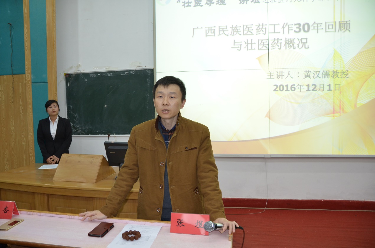 学院张煜书记发表了热情洋溢的开坛致辞。他说,“壮医寻理”讲坛是我院重要的学术交流和知识传播平台,希望通过讲坛的举办,能使我院形成一股探索和寻求壮医学术和文化的潮流,让壮医知识可感,让学术思想可触。张书记强调,“民族的才是世界的”,并以校训“弘毅自强,传承创新”激励壮医学子要传承、发扬壮医,打造世界品牌。