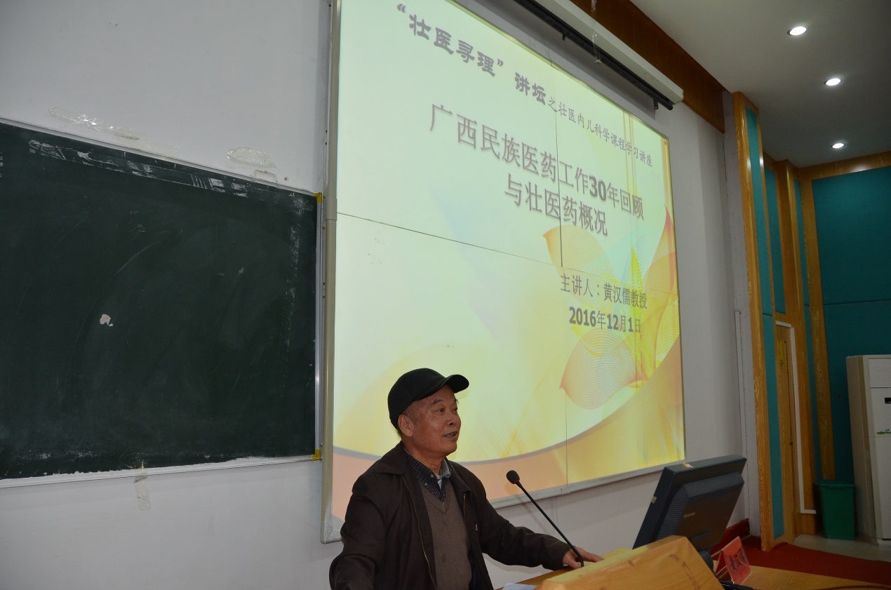 12月1日晚上7点30分,在beat365西梯一教室,中国民族医药学会副会长、桂派中医大师黄汉儒教授,应邀来我院参加“壮医寻理”讲坛之《壮医内儿科学》课程学习讲座,并做了主题为“广西民族医药工作30年回顾与壮医药概况”的专题讲座。我院党总支书记张煜教授、院长林辰教授、副院长韦杏副教授及壮医药学院部分老师参加了本次讲座。讲座由我院壮医学专业2014级学生庞婷婷主持。